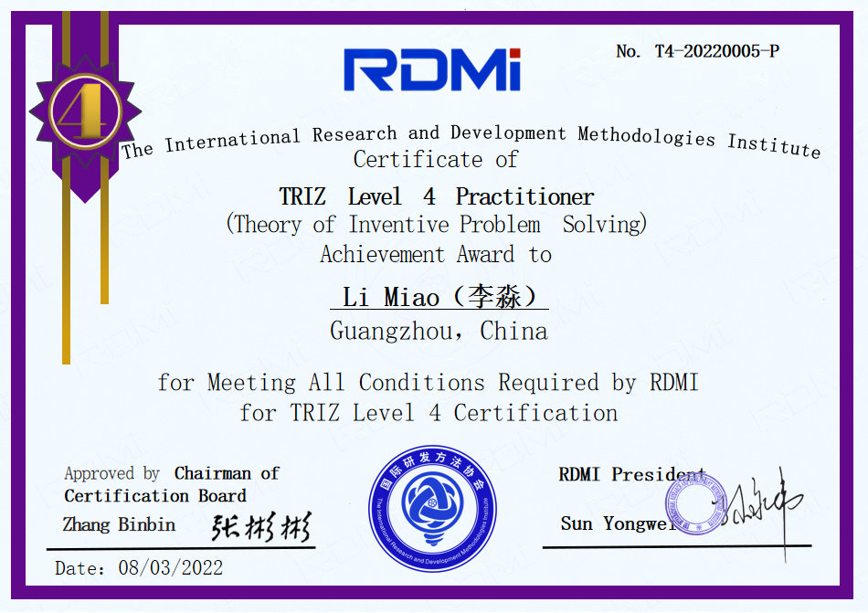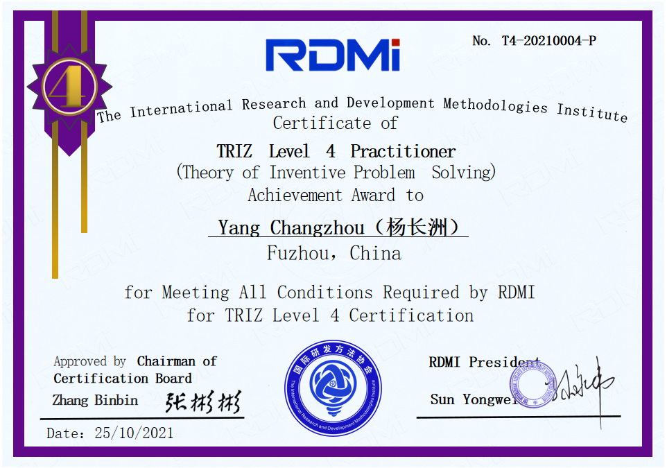 杨长洲先生获得RDMI(国际研发方法协会)TRIZ四级证书