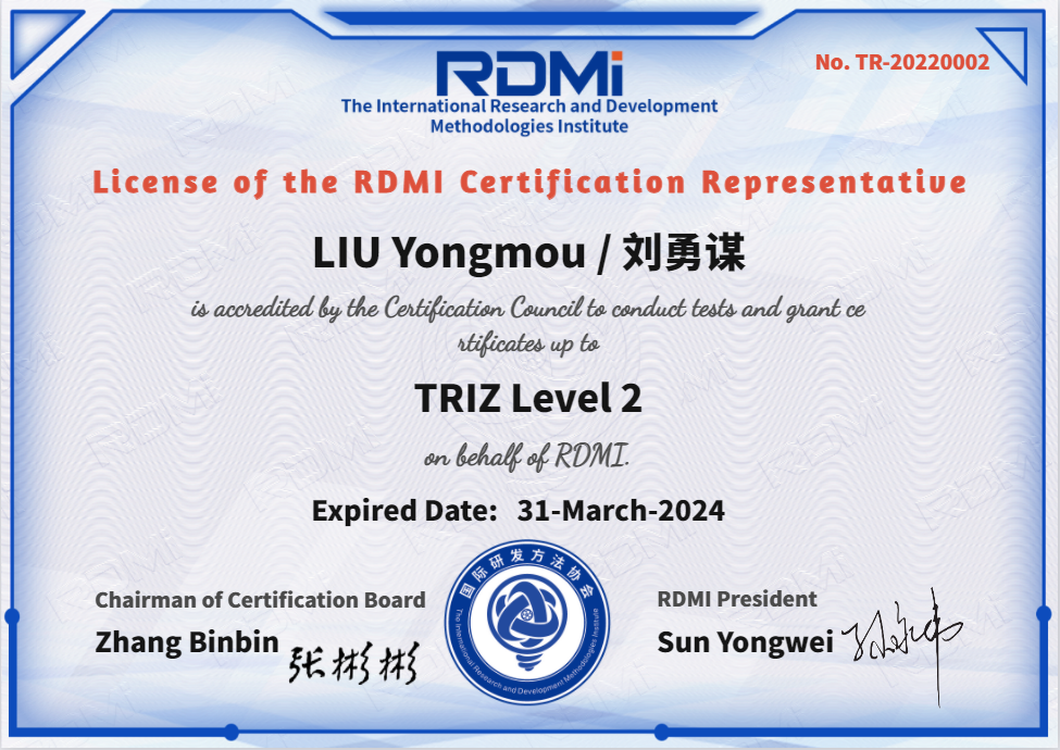 热烈祝贺刘勇谋老师获得RDMI (国际研发方法协会)TRIZ二级认证资质