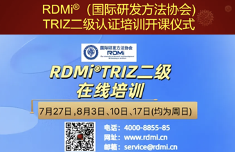 为培养更多高水平、熟练掌握高效研发方法论的创新专家,提高企业的创新能力,使他们有更强的创新能力来应对VUCA(多变性、不确定性、复杂性、模糊性)时代的挑战,RDMi®(国际研发方法协会)于2025年7月27日,8月3日、10日、17日(均为周日)成功举办了为期4天的线上TRIZ二级培训。通过认证考试的学员,获得了由RDMi®颁发的TRIZ二级认证证书。 本次TRIZ二级培训面向具备一级TRIZ基础...