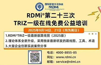 各位研发方法爱好者们:大家好! RDMi®计划于2025年9月3日(周三)晚19:00-21:00在西安-国网陕西技培本部燃管中心举办研发方法座谈交流会活动。欢迎您参加本次活动,一起交流企业中高效的研发方法论,如创新工程学理论体系、研发方法理论体系、TRIZ发明问题解决理论、DFSS六西格玛设计、DoE试验设计、VoC客户需求挖掘等。内容包括但不限于:研发方法理论体系现代TRIZ理论AI在研发中的...