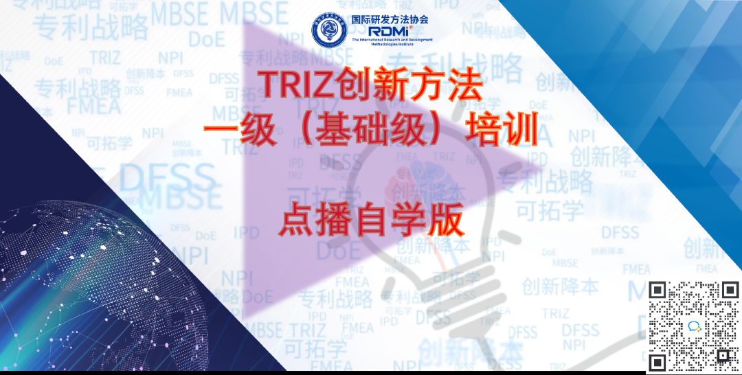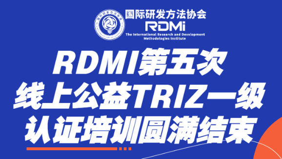 各位研发方法爱好者,大家好,   为培养更多高水平、掌握更有效研发方法论的工程师们,提高企业的创新能力,RDMI®(国际研发方法协会)已多次成功举办了不同级别的TRIZ培训,为企业培养了大量高素质的研发人员。为使更多研发方法论爱好者们更方便地接受培训,RDMI推出了在线培训方式。   本次二级TRIZ培训,面向具备一级TRIZ基础的人员,不具备一级基础的人员可以联系班主任老师咨...