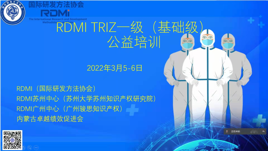 2022年春,随着天气转暧,新冠疫情又在全国各地多点爆发,近来尤以苏州、深圳、东莞、呼和浩特等地最为严重。为了助力当地民众抗击疫情,缓解疫情封闭期间的压力,3月5日-6日周末,RDMI(国际研发方法协会)联合RDMI苏州中心(苏州大学苏州知识产权研究院)、RDMI广州中心(广州骏思知识产权)、内蒙古卓越绩效促进会共同举办了线上TRIZ一级认证培训公益活动,向受疫情影响地区的人们奉献爱心,这也是RD...