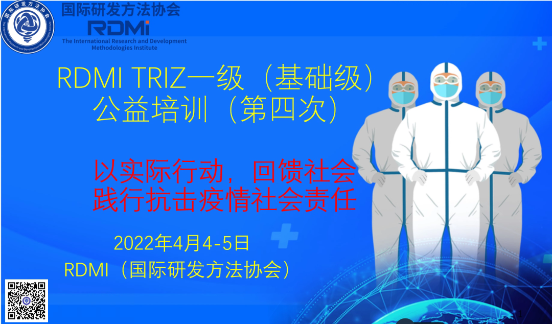 在刚刚过去的清明节小长假中,当许多人还沉浸假期的时候,有些人却因为疫情的影响被封闭在家,RDMI(国际研发方法协会)的方法论专家们感同身受,为配合社会抗击疫情,以实际行动践行社会责任,回馈社会,4月4-5日假期,RDMI在线举办了1000多人TRIZ一级公益免费培训。此次活动主要面向上海并且兼顾了全国各地受疫情影响较为严重的地区,为各地抗击疫情行动贡献绵薄之力...