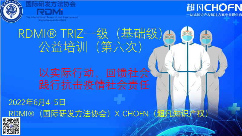 各位研发方法爱好者们,大家好:  为以实际行动践行社会责任,配合全国人民抗击疫情,RDMI®将与中国知识产权领域的创新企业——智慧芽(PatSnap)强强联合,共同在7月16-17日举办为期两天的TRIZ一级在线免费公益培训,回馈社会,大幅降低企业技术创新的门槛,为企业创新打下坚实的基础。这也是继RDMI于2020年3月、2022年3月5-6日、3月26-27日、4月4-5日、5月2-4...