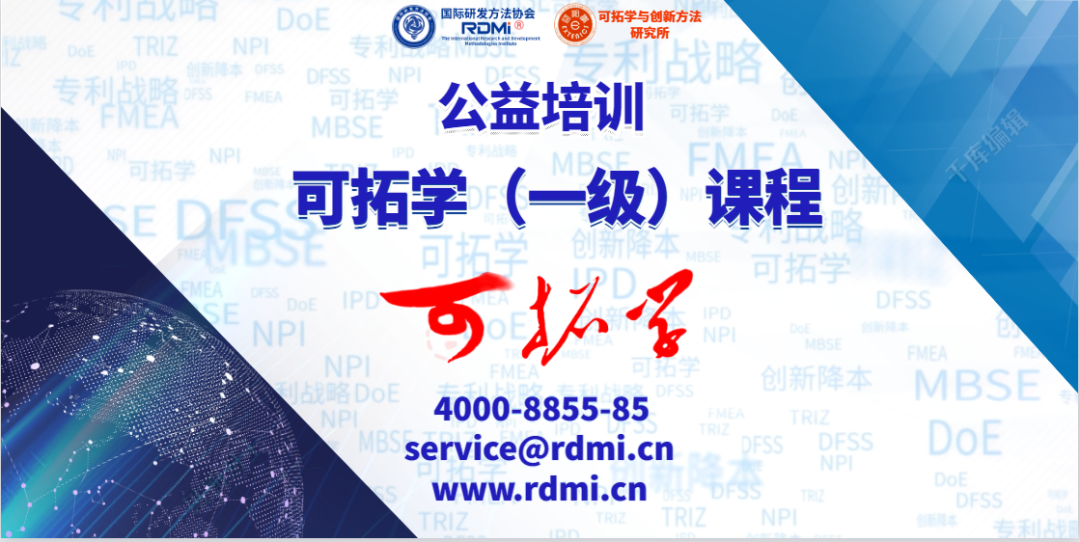 各位研发方法爱好者们,大家好:为推广先进的创新方法论,提升社会各界人士的创新能力,RDMI®将与广东工业大学可拓学与创新方法研究所强强联合,将于7月2-3日举办为期两天的可拓创新方法一级在线免费公益培训。以实际行动践行社会责任,推广中国原创创新方法论,回馈社会,降低企业技术创新的门槛,为企业创新打下坚实的基础。这也是继RDMI®六次举办公益培训以来的第七次免费公益培训。前六次的活动共有6000多人...