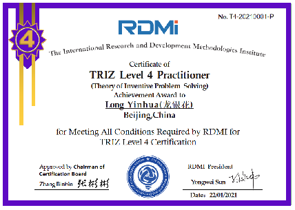 龙银花博士获得RDMI(国际研发方法协会)TRIZ 四级证书